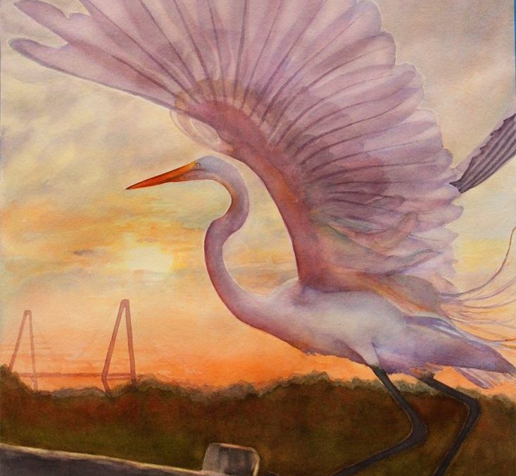 preening egret watercolor in Charleston. Ravenel bridge in distance