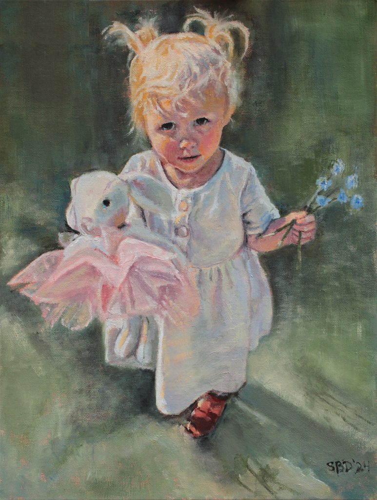 Because of the angle of the board, the paint descended – fast! I kept laying in the original color as it descended down the page. As I got closer to the girls’ heads, I started dropping in a pink/coral color and some Quinacridone Gold. You literally do drop the colors in and they fan out and blend, creating a beautiful look which is unique to watercolor. It’s beautiful!