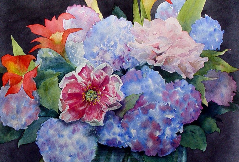 Floral arrangement in vase with hydrangeas, lilies and peonies