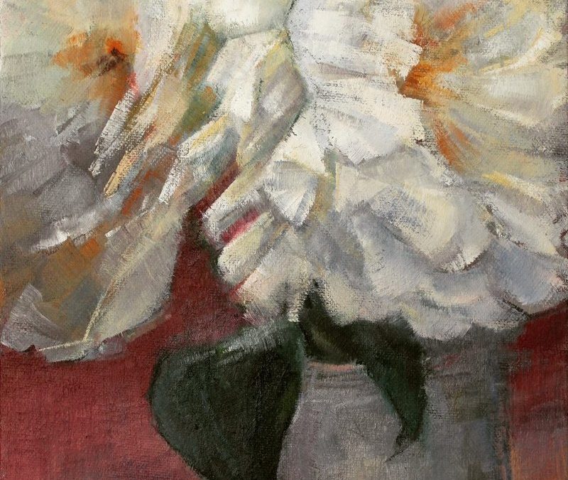 oil on canvas painting of peonies in a pitcher
