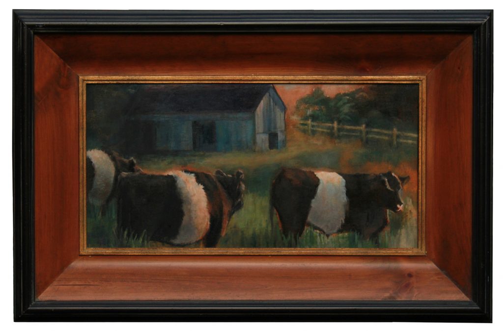 Belted Galloways (Oreo cows)in a beautiful wood and gold frame. Oil on canvas 24″w x 12″h.