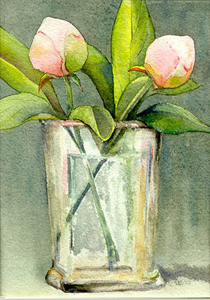 Peonies in a Vase, a watercolor print, has lovely soft colors of pink and green. This is one of my more popular prints, and looks good in almost any room, even the bath!
