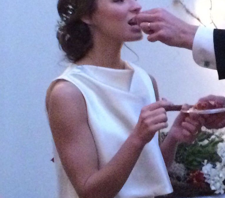 Katrina eating the cake, and a glimpse of the wedding dress neckline