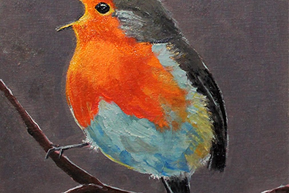 colorful bird oil painting on wood. 6″ x 6″ x 1 3/4″